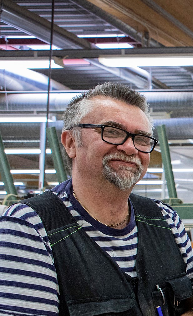 Kaj on tehnyt työtä prosessin alkuvaiheessa koko työuransa. Ensimmäiset vuodet oli sekä höylä- että katkaisulinjalla sekä liimapuulevyjen valmistus. Myös tavaran lastaaminen ja purkaaminen kuului hänelle. Tärkeä tehtävä vielä tänäpäivänä on tavaran vastaanottoa ja laaduntarkastus.